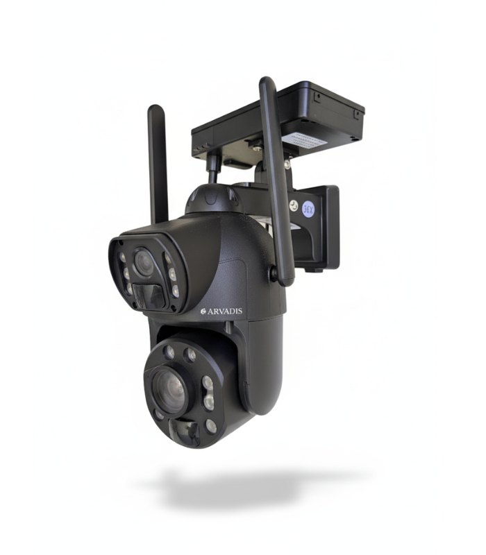 Caméra solaire ARVADIS double lentille, 24 MP, zoom optique 36X, batterie 12000 mAh et deux panneaux solaires (20W au total) – disponible en version 4G SIM ou WiFi 2.4 GHz + Bluetooth.